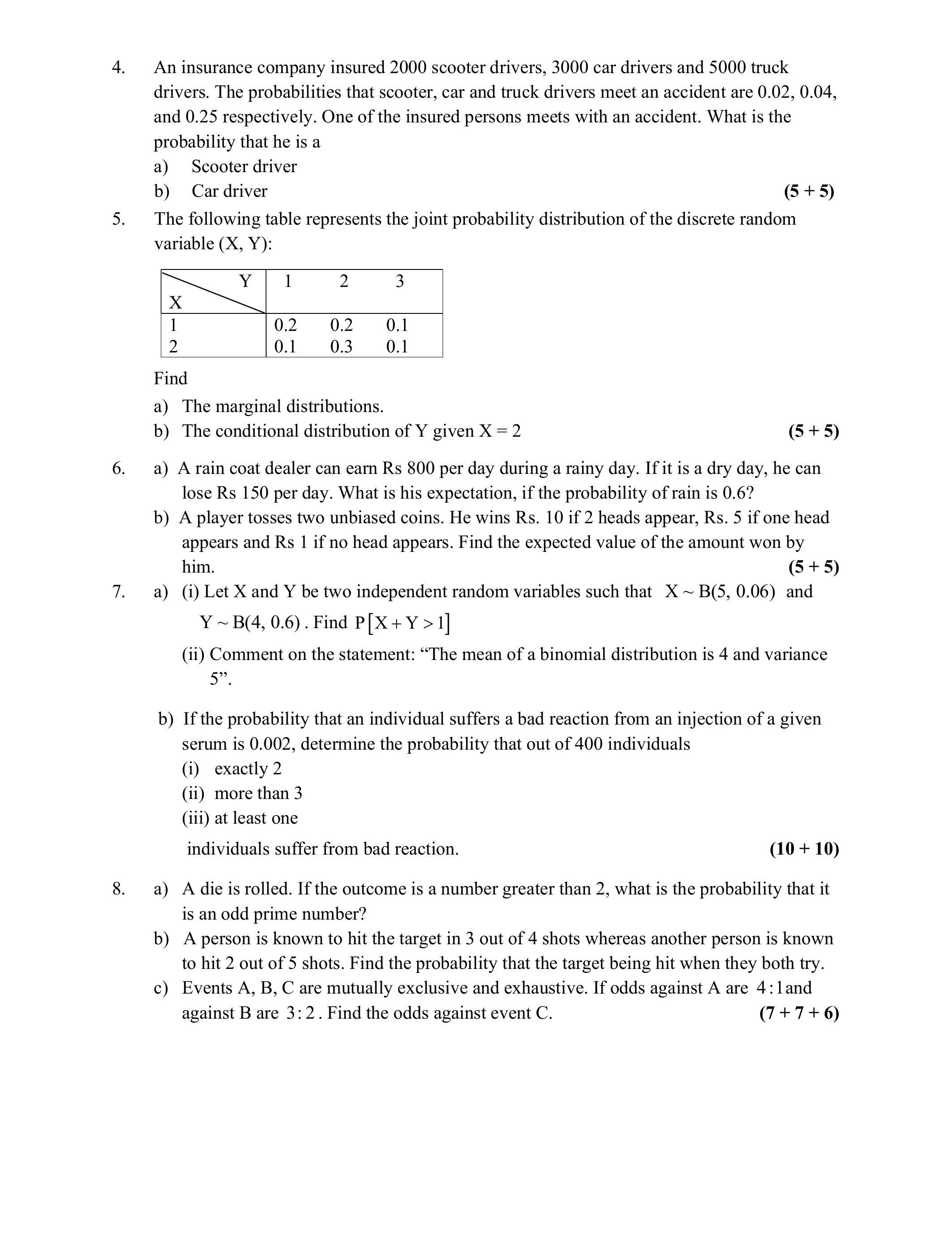 7. a) (i) Let \(\mathrm{X}\) and \(\mathrm{Y}\) be two independent random variables such that \(\mathrm{X} \sim \mathrm{B}(5,0.06)\) and \(\mathrm{Y} \sim \mathrm{B}(4,0.6)\). Find \(\mathrm{P}[\mathrm{X}+\mathrm{Y}>1]\)